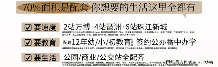 项目紧邻南大干线,这条番禺的“黄金生命线”串联了莲花湾、国际创新城、万博、广州南站四大价值中心。通过南大干线及南沙港快速,可快速接驳琶洲、金融城、珠江新城。加上距离地铁站2站到万博、4站到琶洲的便捷性,通勤效率极高。