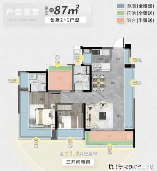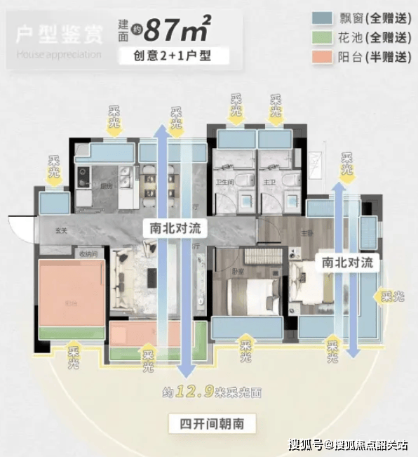 目前在售户型面积范围为87㎡至134㎡,所有户型均朝东南或西南方向,通过优化设计实现了超100%的实用率。具体户型亮点如下: