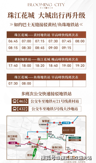 4. **问**:珠江花城周边的公交线路在周末的运营时间有变化吗?**答**:目前珠江花城周边公交线路465/432路及如约巴士地铁专线,周末运营时间与工作日基本一致,但具体可能会因节假日等特殊情况调整,您可拨打400 - 655 - 7089查询最新运营时间。