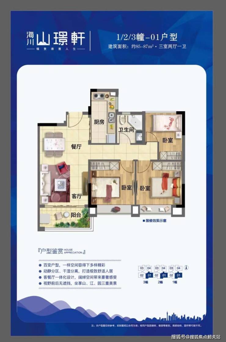 项目主推舒适实用小户型,在售建筑面积62-87平方二至三房,户型设计精致,通风采光俱佳,南北对流,兼顾私密和舒适度,刚需置业,贴心的空间运用和人性化设计,产品打造更是全面展现舒适人居理念。