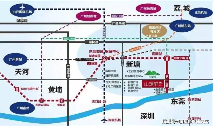 与官湖站仅一站之隔即广州东部TOD新塘南站,九轨交汇(地铁 13/16/20/28 号线、穗莞深轻轨/新白广城际、广深/广汕/京九铁路),融入粤港澳大湾区一小时生活圈。