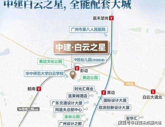 中建・白云之星卖点满满。其地处白云设计之都核心,周边超百家总部企业,高端购买力汇聚,圈层纯粹,发展潜力巨大。交通十分便捷,离地铁 2 号线黄边站不远,在建的 14 号线二期彭边站更是近在咫尺,自驾通过空港大道、广佛肇高速,能快速抵达白云新城、天河等商圈。教育资源优质,内部配建 9 班幼儿园,西侧规划九年一贯制华中师范大学白云学校,由黄边小学升级而来,预计 2026 年 9 月小学开学,教育质量有保障。商业配套丰富,自带约 2 万㎡商业街,周边大型商业中心云集。医疗资源便利,5 公里内有两所医院。生态景观优越,毗邻黄边艺术公园,未来与多个公园串联。产品设计高端,外立面与园林独具匠心,还配备双层游廊式泛会所等。智能化配置先进,全屋华为鸿蒙智能系统。再加上中建三局与白云城发联合开发,实力雄厚。不过,交房时间较晚,要到 2027 年 12 月 31 日。