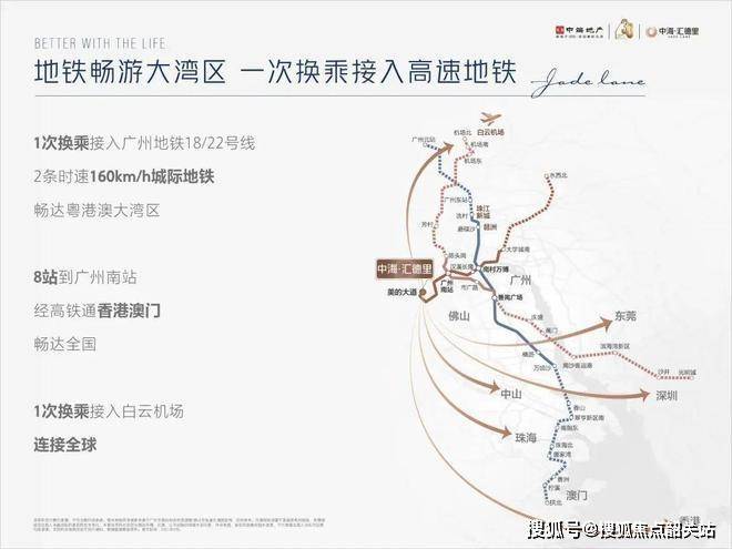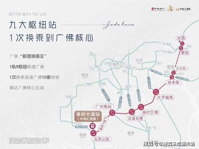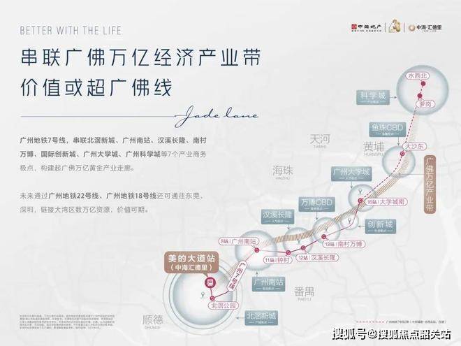 中海·汇德里,作为广州地铁7号线TOD项目的代表作,地处广州和佛山的核心交界地带,位于广州地铁7号线美的大道站上盖,享受着前所未有的地铁枢纽便捷交通,成为广佛区域不可多得的精品物业。项目依托广州7号线的快速交通优势,快速接入大湾区多个核心区域,实现了大湾区“一站式”畅通,能够轻松连接广佛、珠江新城、白云机场等重要商务与交通节点。7号线作为广佛连接的第二条地铁线路,不仅将北滘新城、广州南站、万博CBD、国际创新城等重要产业商务极点串联,更构建了一条“广佛万亿经济产业带”,这为汇德里提供了雄厚的产业背书和无限的发展潜力。