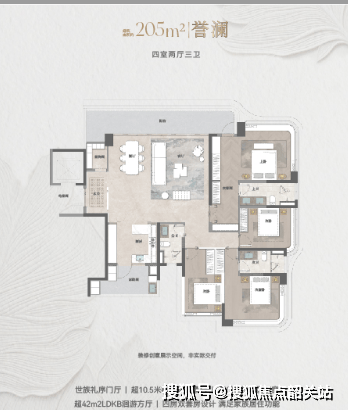 建面约205㎡誉澜户型,兼顾改善尺度与居住性价比,四室两厅三卫规划,约100%高使用率设计,空间拓展性极强。超10.5米极阔观景景台贯穿南向立面,超42米LDKB洄游方厅,打造灵活多变的互动空间,可根据家庭结构与生活习惯自由改造布局,适配三口之家、二胎家庭或三代同堂的居住需求。整体户型动线合理,浪费面积极少,全明厨卫设计,保障居家干爽通透,大面积采光界面,让每一个生活空间都能拥有良好的视野与采光条件。