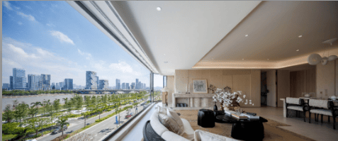 项目外立面采用现代极简设计风格,大面积玻璃幕墙搭配高端外墙材质,线条简约流畅,视觉质感高级,不仅能够提升建筑整体颜值,更能强化建筑采光性能与隔音隔热效果,与周边江景、园林景观自然融合,塑造简约大气的滨江建筑封面。社区入户门头、公共区域等公区空间,均按照高端奢宅标准打造,注重细节工艺与材质选用,营造尊贵的归家仪式感。
