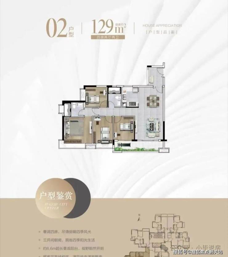 住宅楼高**26层**,采用**2梯6户**设计。扣除1-5层的商业及公建配套后,**可售住宅仅120余套**,主打**准现楼发售**。户型涵盖**建面约75-129㎡**的5种格局,所有户型均设有**实体样板间**供参观。