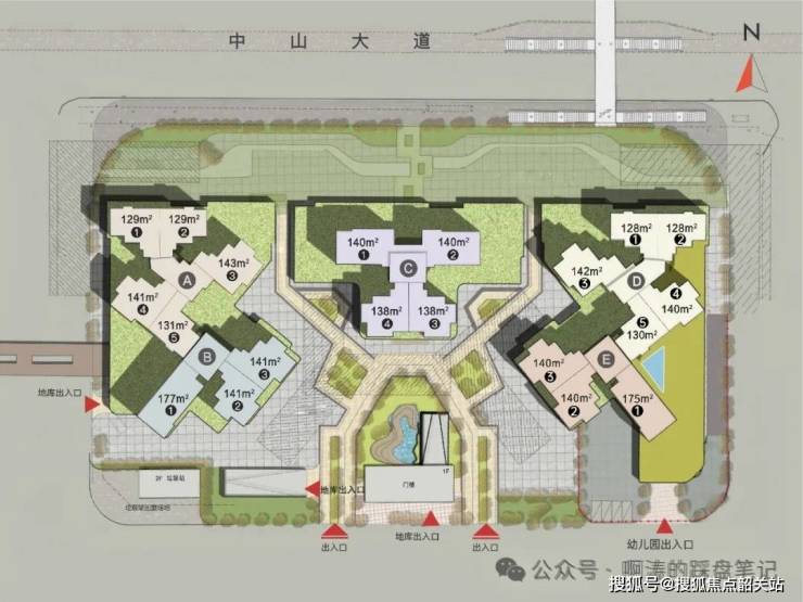 楼栋规划:共计5栋高层住宅建筑,社区规划规整有序