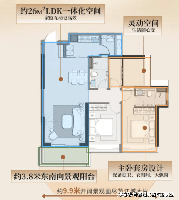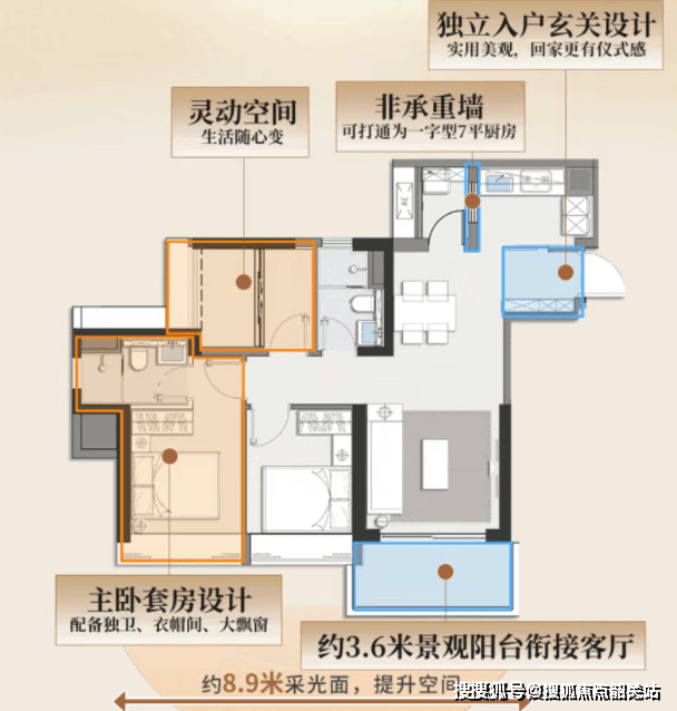 87平米小户型:虽然空间有限,但做到了“麻雀虽小,五脏俱全”,并且比市面上同类产品更具优势。少承重墙化设计,次卧可打通或隔开,生活阳台也能与厨房打通,形成全明空间。主卧配有独立卫浴,增加私密性。
