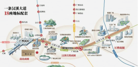 黄金动脉:南站黄金8km范围内聚集了番禺区70%的经济总量和常住人口,拥有前沿的产业体系和集中的商业配套,成为广州不可复制的“黄金动脉”。
