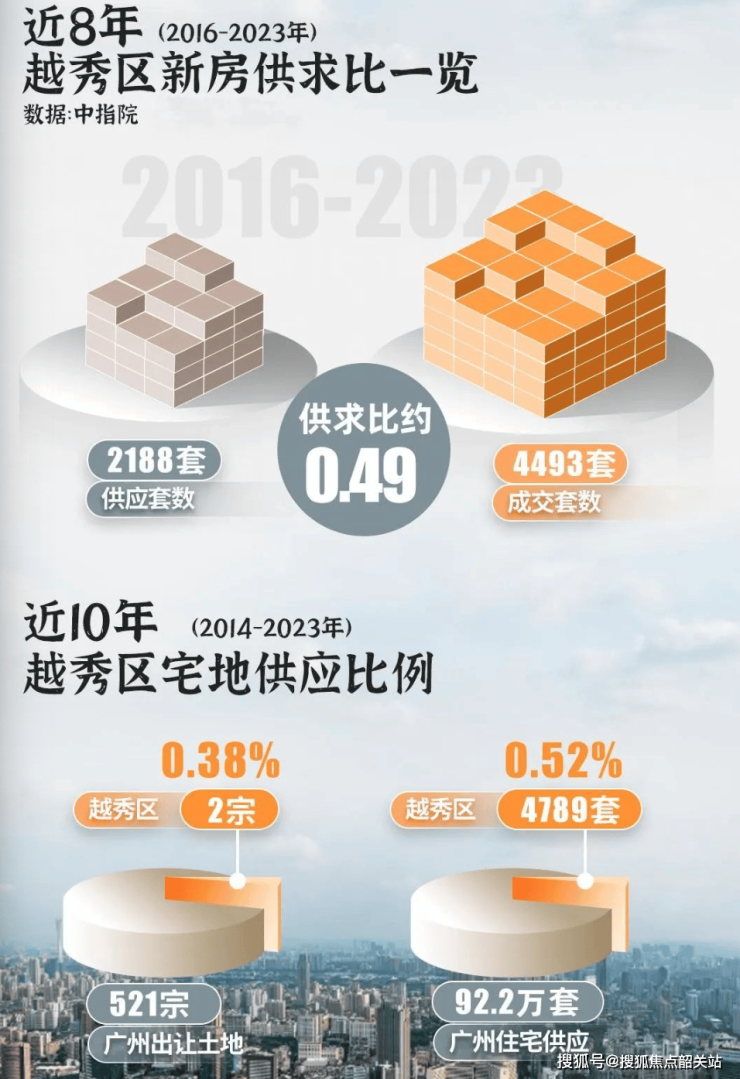 过去10年广州共出让521宗宅地,越秀只占比0.3%。新房平均供求比仅有0.62,未来五年严重供不应求。