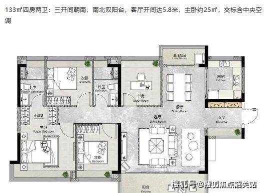 住宅交付精装修,133㎡四房户型含中央空调配置,厨房及卫浴空间配备高品质建材及智能设施,保证住宅交付的整体品质。室内布局兼顾储物、动静分区及舒适度,注重居住体验与细节考量。