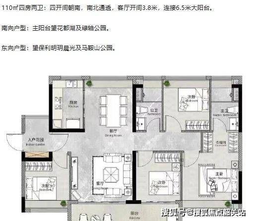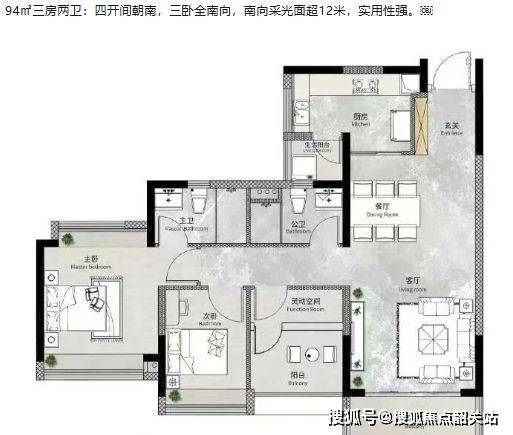 住宅户型设计注重全南向采光及空间灵活性。94㎡三房采用四开间朝南布局,主卧及次卧均朝南,南向采光面超过12米;110㎡及133㎡四房户型采用十字厅布局,客厅开间宽敞,南北通透设计充分保证室内空气流通与采光,部分户型配置阳台或入户花园,实现生活空间功能最大化。