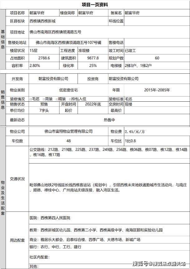 朝富华府位于西樵镇西樵新城商圈,凭借西樵镇强大的经济实力、丰富的产业结构以及发展潜力,具有较大吸引力。尽管目前部分配套信息暂未明确,但基于西樵镇整体发展态势,未来交通、商业、教育、医疗等配套有望不断完善。无论是刚需购房者寻求稳定发展区域的住所,还是投资者看重区域潜力,朝富华府都值得关注。随着西樵镇持续发展,项目居住价值和投资价值有望进一步提升。