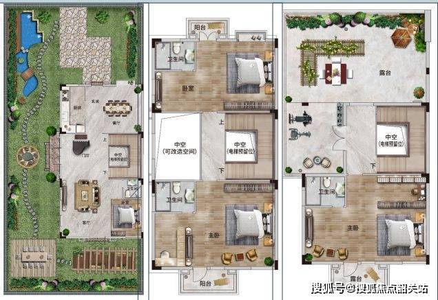 四联二层半,建筑基底卙地约100㎡,6.6米开间客厅面积:65㎡,双主套设计带约67-125㎡超大花园露台+中空赠送面积约50㎡284㎡联排别墅