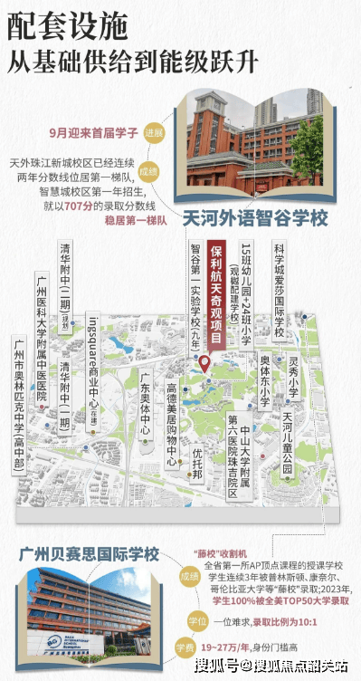天河外国语智谷学校分为两个校区,其中越秀观樾配建24班小学,缦云广州配建的九年制学校(18班小学+27班中学),已经在今年9月份正式开启报名招生,学校占地面积广阔,总建筑面积22753.44平方米,教学楼、实验楼、图书馆等设施一应俱全,先进的硬件条件为教育教学活动提供了坚实保障,能够满足学生多样化的学习需求。规划布局的南、北两个校区,总计有4500个学位,南校区设初中30个班,可容纳近1500名学生;北校区设高中60个班,可满足近3000名学生就读需求,覆盖幼小初,教育一步到位,让家长再也不用为孩子的上学问题发愁。