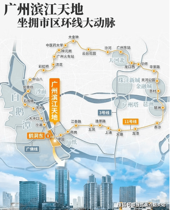 出行便捷度直接决定生活效率。项目门口即是地铁11号线鹤洞东站(直线距离不足200米),作为广州首条环线,11号线高效串联珠江新城、琶洲、金融城等核心CBD。未来还可通过3站接驳在建的22号线,南延直通深圳,融入粤港澳大湾区“1小时生活圈”。