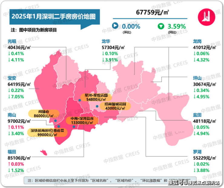 图:2025年1月深圳各市辖区二手住宅挂牌均价及环同比数据来源:中指数据CREIS(点击查看)市场监测:https://www.cih-index.com