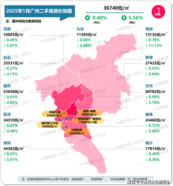 图:2025年1月广州各市辖区二手住宅挂牌均价及环同比数据来源:中指数据CREIS(点击查看)市场监测:https://www.cih-index.com