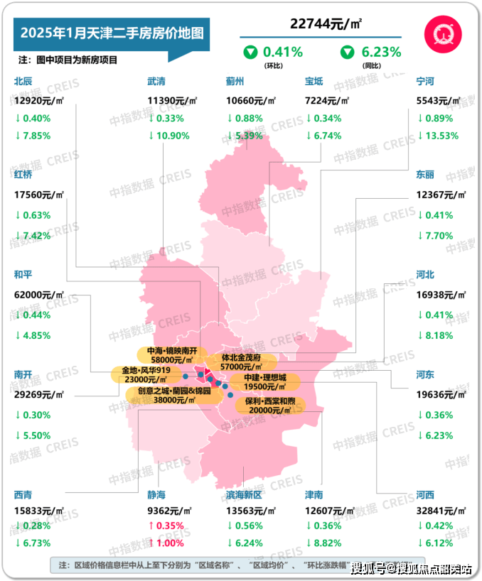 图:2025年1月天津各市辖区二手住宅挂牌均价及环同比数据来源:中指数据CREIS(点击查看)市场监测:https://www.cih-index.com