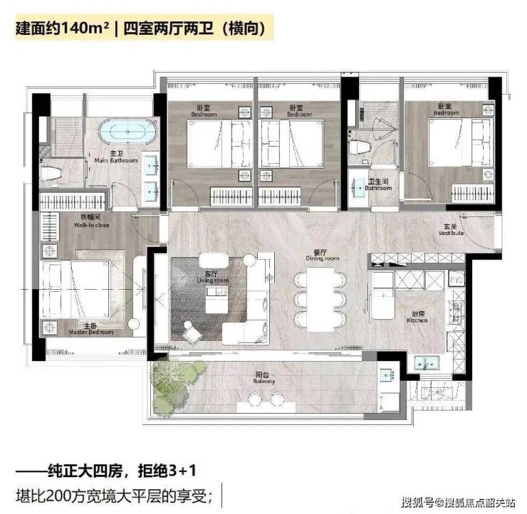 建面约140m² | 四室两厅两卫(横向)——纯正大四房,拒绝3+1 堪比200方宽境大平层的享受;——全家人的阳光SPA三面采光,光照时间无限延长,生活更敞亮;——跑道式阳台,不受空间拘束约7.7米超长阳台,在家就能打高尔夫;——奢阔主卧套房,二人世界的浪漫天地约34.7m²五星级超大主卧,洗浴-更衣-赏夜-入眠尊崇生活;