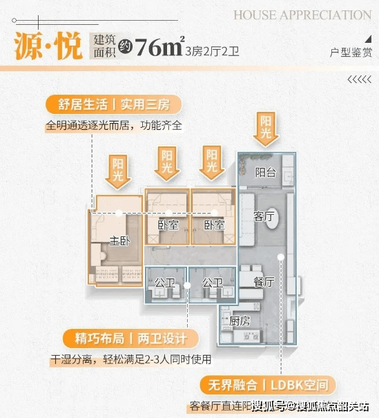 答:项目所有户型使用率均约 100%,尤其 76㎡三房两厅两卫户型表现突出,通过优化过道、多飘窗全赠送、阳台半赠送等设计,实际使用空间接近传统 85㎡左右户型,客厅、卧室宽敞无压抑,刚需家庭居住无压力;121-125㎡四房还采用大横厅设计,空间利用率进一步提升。