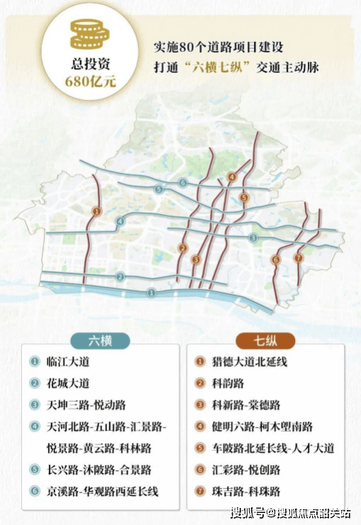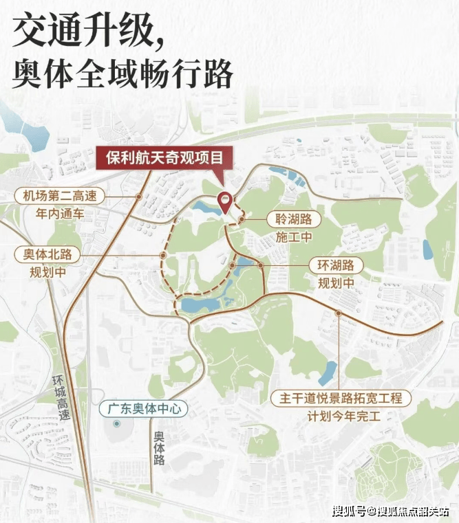 交通通达性是衡量一个区域价值的重要标尺,而保利辰园湖境所在的天河智谷板块,正迎来前所未有的交通升级机遇。虽然项目距离最近的地铁站——21号线大观路站直线距离约1.7公里,步行需20分钟左右,但这并不意味着出行不便。恰恰相反,随着全运会的临近,奥体板块乃至整个广州的交通网络正在经历一场深刻的变革。政府已启动总投资达680亿元、涵盖80个道路项目的升级计划,旨在打通“六横七纵”的交通主动脉,全面提升区域的通行效率。