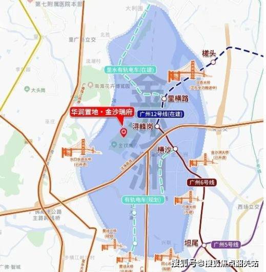 金沙瑞府位于白云区金沙洲板块,可通过轨道交通与城市道路系统实现广佛区域的通勤联通。轨道交通方面,项目与地铁6号线及12号线浔峰岗站存在直线距离连接,可实现与荔湾、越秀、天河等中心城区的轨道换乘通达。道路方面,金沙洲区域拥有大坦沙大桥、水道口大桥、黄岐大桥、金沙洲大桥等多座跨江交通设施,形成内联白云与荔湾、外接佛山中心区域的通勤方式。此外,沉香大桥、同心桥等工程仍在建设中,碧江大桥亦处规划阶段,未来将进一步改善片区道路穿透能力。