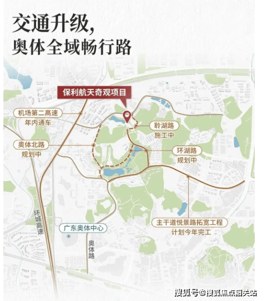 交通配套方面,项目依托奥体板块与天河智谷的交通路网,实现多维通勤全覆盖,兼顾便捷性与舒适性:地铁出行上,最近的地铁站为21号线大观路站,距离约1.7公里,步行约20分钟,日常可通过电瓶接驳车往返地铁站,便捷换乘直达天河CBD、珠江新城等核心区域;自驾出行上,项目北侧紧邻智慧城、科学城,驱车前往金融城约8公里,前往珠江新城约15公里,全程路网通畅,通勤效率高。