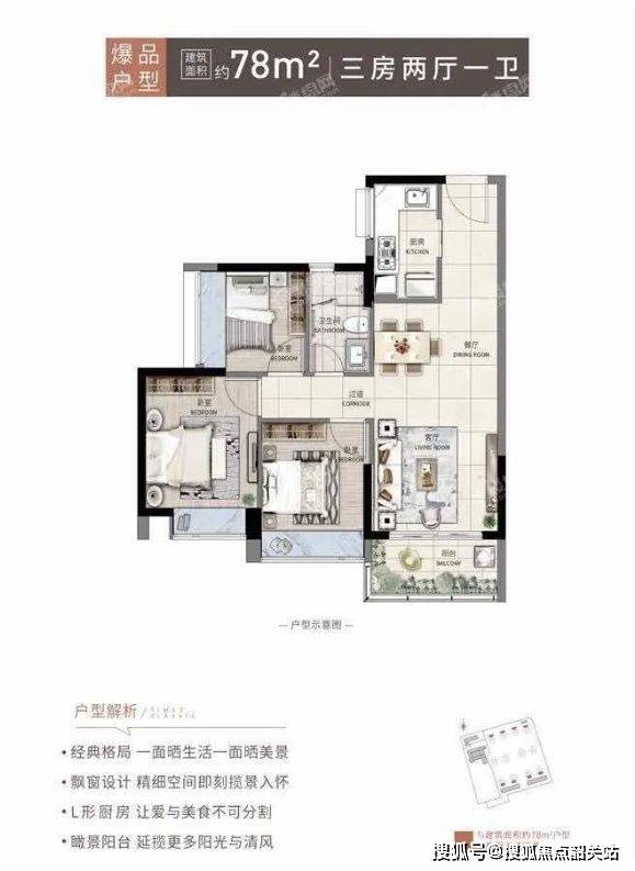 舒适尺度:三房设计,空间更加宽敞,居住舒适度提升。两个卫生间的配置,方便家庭成员使用,尤其适合多人口家庭。客厅连接阳台,增加室内采光与通风,同时提供休闲观景空间。
