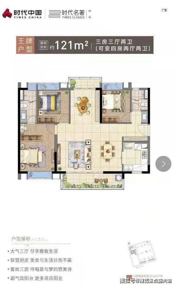产品信息:主推 77㎡三房两厅一卫、100㎡三房两厅两卫、106㎡三房三厅两卫(可改四房两厅两卫)、121㎡三房三厅两卫(可改四房两厅两卫) 带装修户型,满足不同家庭结构和预算需求。