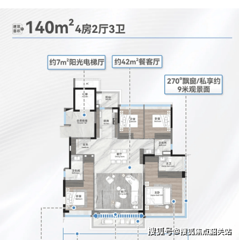 125-140㎡三房 / 四房:2 梯 2 户板楼,层高 3 米,全明格局,双阳台设计,主卧带 270° 飘窗,窗地比达 38%(远超广州常见 0.25 标准),实测得房率 105%-110%,较同板块同面积段户型多出 10-15㎡实用空间,适合刚需改善型家庭,单价较周边高端项目低 0.5-0.8 万 /㎡。