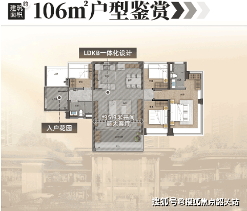 106平方米四房两厅两卫:客厅宽度不少于5米,但房间设计稍显不足,没有做到三个房朝南。