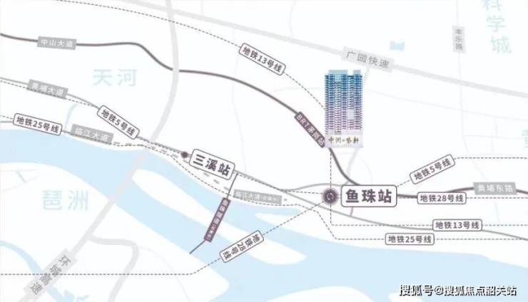 中洲紫轩位于黄埔茅岗板块,地处鱼珠临港经济区和广州国际金融城交汇的重要节点。项目距离地铁5号线和13号线的鱼珠站仅400米左右,步行大约8分钟即可到达,为居民提供了便捷的公共交通条件。此外,项目门口即为BRT茅岗站,中山大道东、黄埔大道、广园快速等城市主干道近在咫尺,自驾出行同样方便快捷。