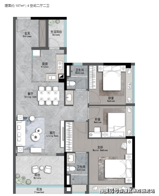 户型价值:建面约90㎡三房两卫户型,采用“LDKB一体化”设计(客厅、餐厅、厨房、阳台无界融合),空间利用率高达85%;主卧套房带独立衣帽间,满足三代同堂居住需求。对比周边竞品,同等面积多一房,性价比“碾压式”领先。