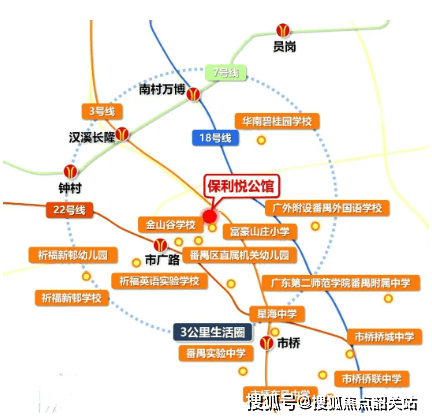 拥有 5 横 5 纵的交通路网,开车出行极为便利。5 横包括新光快速、华南快速、番禺大道、市广路、东新高速;5 纵涵盖汉溪大道、南大干线(建设中)、广明高速、东环路、兴业大道。项目紧邻新光快速,开车 10 分钟可达万博,25 分钟可达琶洲,30 分钟可达珠江新城。虽地铁稍显不便,最近的 22 号线市广路站直线距离约 1km,步行约 2 公里需半小时,但项目门口设有公交总站,且富豪山庄、金山谷的交通巴士间隔约 8min 一班,在悦公馆门口设站,可直达汉溪长隆站,或选择电动车接驳,出行方式多样。
