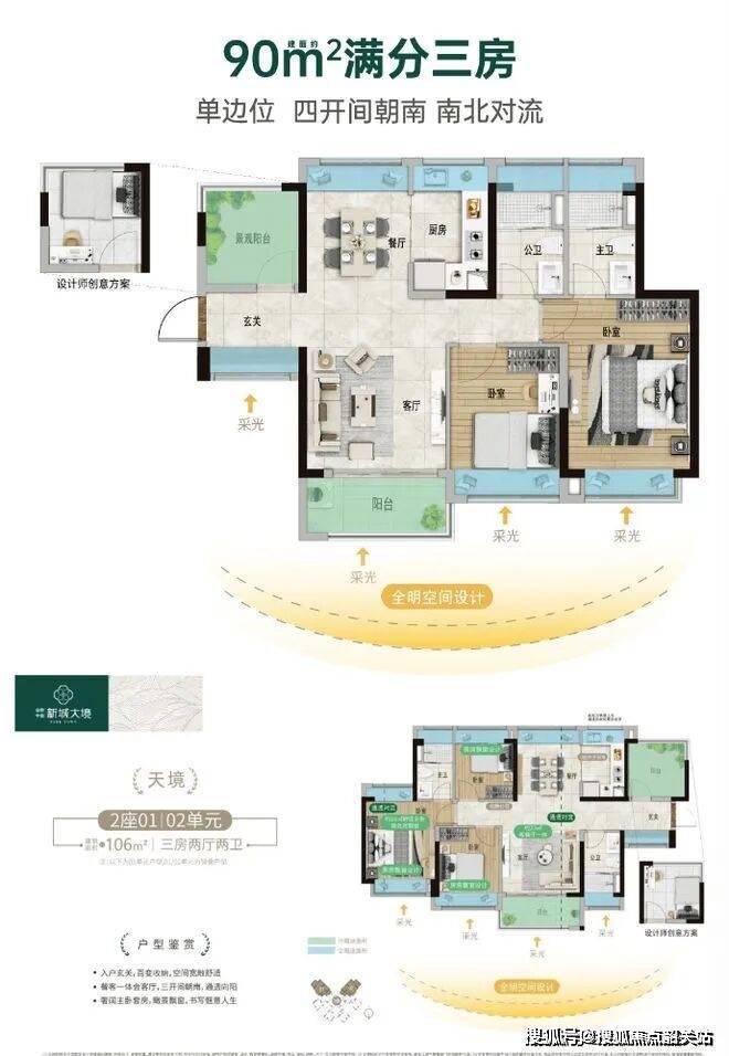 106㎡四房两卫:南北通透,双阳台配置,主卧套房化,满足二胎或三代同住需求。