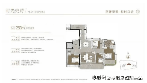 253平方米户型:四房两厅两卫竖厅设计,南北对流,拥有10米长的阳台。主卧飘窗和主卫均为270度弧形采光面,视野开阔,充分展现了豪宅的奢阔与舒适,适合追求极致居住体验的高端客户。