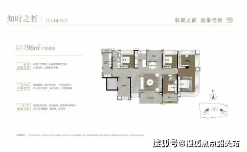 196平方米户型:双主套设计,客厅、卧室、阳台等开间尺度较同面积段产品更大。样板间由梁志天团队设计,借鉴爱马仕等奢侈品创意,采用原木风格,清新典雅,视觉体验丝滑,提升了居住品质与独特感。