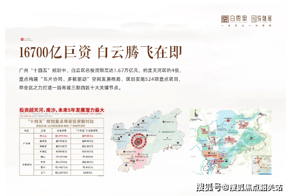 区域发展 广州白云区正处于腾飞时期,十四五规划总投资高达1.67万亿元,正逐步成为广州标志性的高端中央商务区。白云新城汇聚航空、生物医药等多类高端产业,设计之都集聚大湾区创新设计品牌,前景广阔。