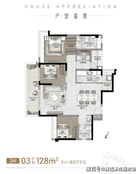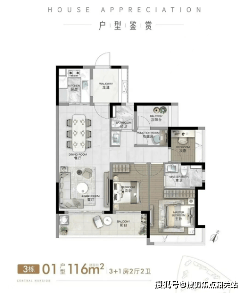 116–128㎡四房:功能分区清晰,满足二胎或三代同住需求;
