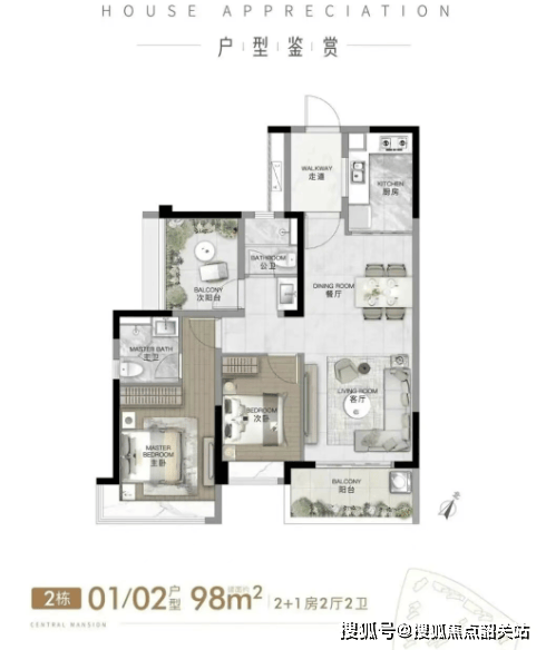 户型设计:98–143㎡全南向精装,得房率90%