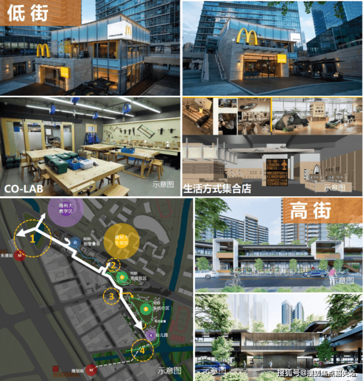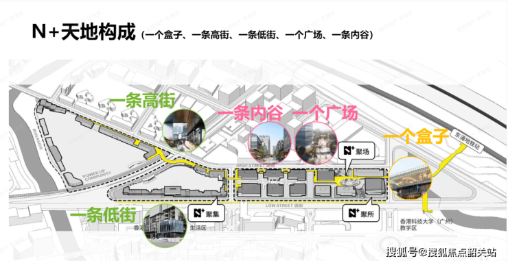 “一个内谷”+“一个广场”两个休闲开放空间;极具潮流气息的“一条低街”商业街区,以及“一条高街”超级空中连廊;还有N+聚所这“一个盒子”。
