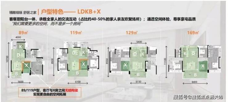 项目打造的约89-169平三至四房,所有户型都创新性地打造了LDKB+X的设计,拉满通风采光效果的同时,餐厅、厨房、客厅和阳台的功能布局也更加灵动,可分可合,恰如其分地融合了生活品质与居住场景的多样性。