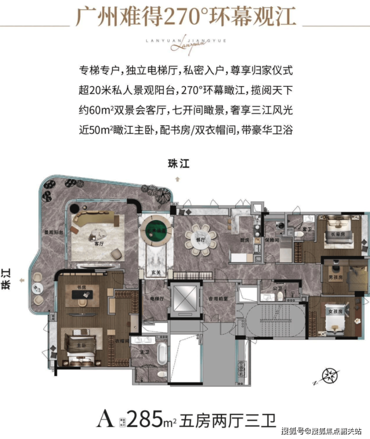 285㎡五房两厅三卫户型,约 60㎡双景会客厅,七开间瞰景,超 20 米私人景观阳台,270° 环幕瞰江,可揽阅三江风光。