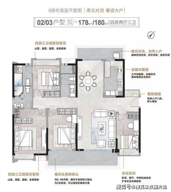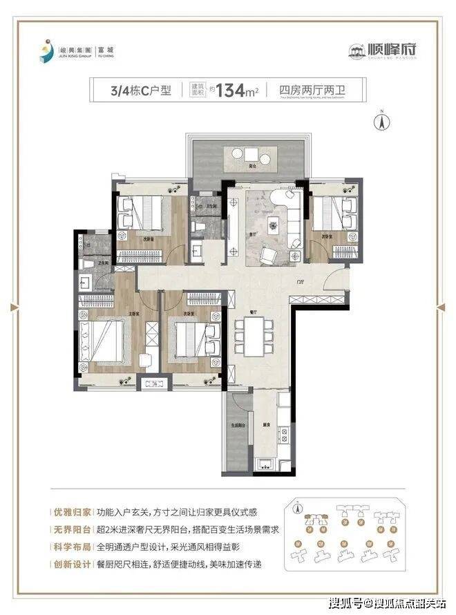 128㎡四房:7.2米江景阳台,主卧套房约20㎡,带270°转角飘窗,实测空间尺度媲美市面140㎡户型;