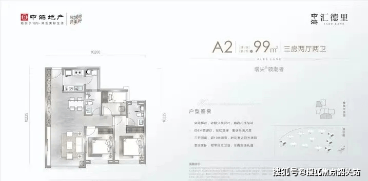 A2户型-99㎡三室两厅两卫里享家——收纳王全明格局,动静分离设计 约30㎡餐客通厅,约4⽶开间 三开间朝南,超10⽶⼤⾯宽 H型厨房,衔接⽣活阳台,拓展空间 套房主卧,附带独⽴卫浴