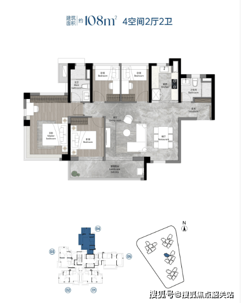 建面约 108㎡四房两厅两卫:凭借超高使用率,实际居住体验堪比传统 120㎡户型,南北通透,空间开阔,适合三代同堂或多孩家庭,能满足家庭成员的多样化需求。