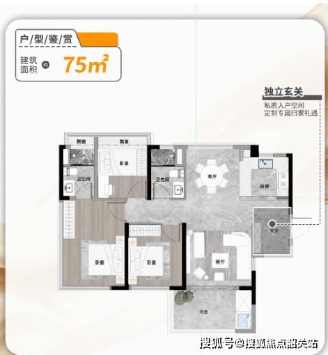 75㎡三房:南北通透,独立玄关可改造为储藏室,U型厨房提升操作效率,主卧带独立卫浴及270°观景视野;