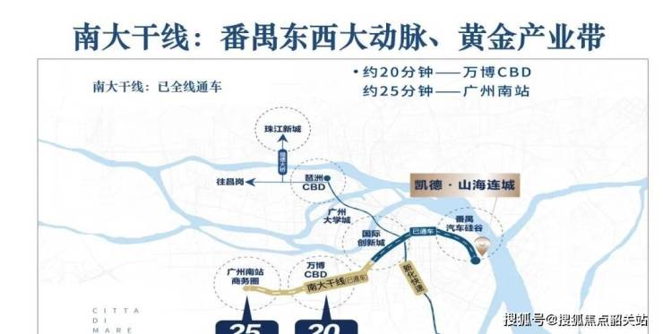 南大干线是番禺区东西向的交通大动脉,全长约30公里,东起莲花大道,西至东新高速。它的全线开通,彻底打通了番禺东部的交通瓶颈。对于凯德山海连城的业主来说,南大干线就是通往繁华世界的快速通道。从项目出发,驶入南大干线,一路向西,可以迅速到达广州大学城、广州国际创新城、万博CBD、广州南站等核心区域。