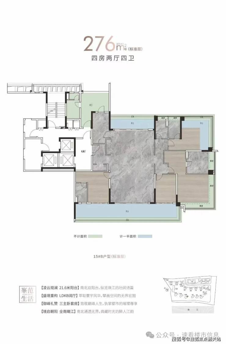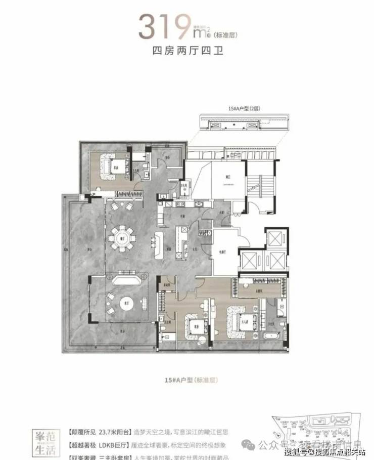 建面约319㎡四房两厅四卫,三主卧套房,实用率超过100%,家里引入了华为智能化交标,近24米跑道式阳台,宽阔LDKB巨厅+全南向望浩瀚江景。